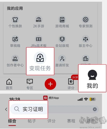 1、打开软件,点击【我的】-【变现任务】或者在虎扑社区搜索【实习证明】
