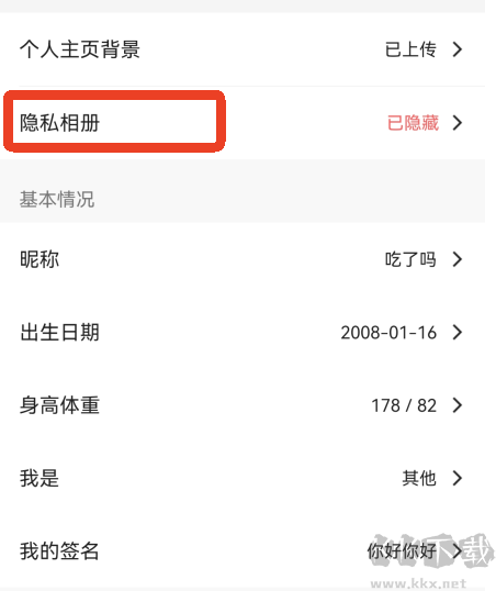 3、点击【开放隐私相册】右边的滑块按钮就能打开了,开启后隐私相册将对所有用户可见。