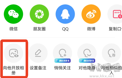 2、下方会弹出一些功能菜单,点击第一个【向他开放相册】就可以了。