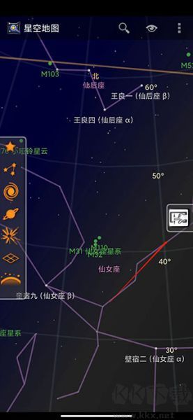 4、菜单图标自上而下依次代表:恒星、星座、梅西耶天体、行星、赤经赤纬坐标网格及地平线。当仅开启恒星显示时,画面已高度接近真实夜空。此外可切换至夜间模式,屏幕将转为暗色并采用红色调。通过底部缩放按钮或双指手势,均可便捷放大或缩小星图。
