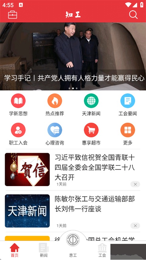 国家要事即时知晓,周边信息迅速掌握,“知工”可为成员准备国内重点消息、天津市总工会重要动态、基层工会近期情况。将独特内容实时展示给成员,成员可随时查看各类新闻。