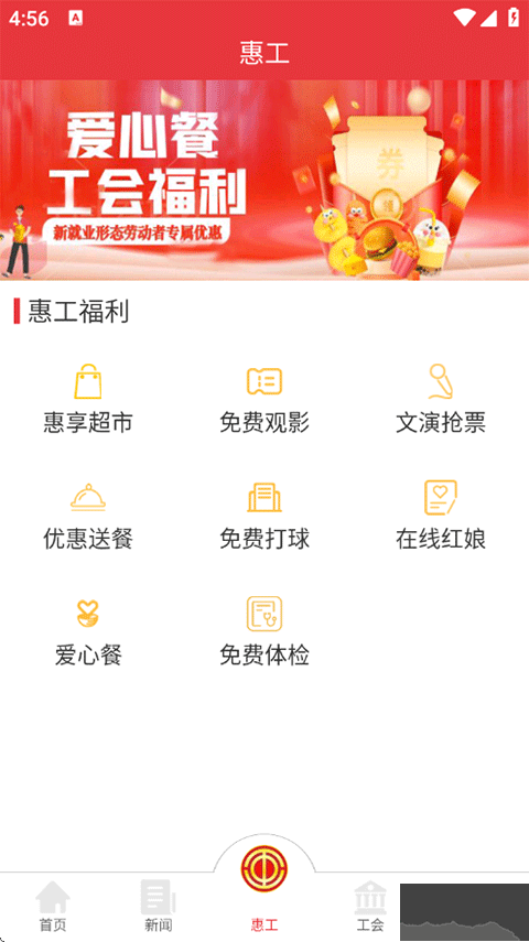 心系职工,为工会成员准备多角度惠工项目,例如特价卖场(限时低价商品)、免付费观影、文艺演出票务领取(免付费观赏演出)、折扣订餐(餐饮外卖减免)、免付费运动等项目,随时便捷使用各项内容。