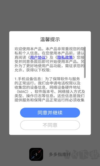 1、下载打开多多指南针app,点击同意;