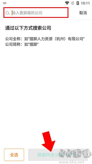6、输入相应关键字,然后选择屏蔽或者点击“全选”,最后点击“屏蔽所选公司”即可
