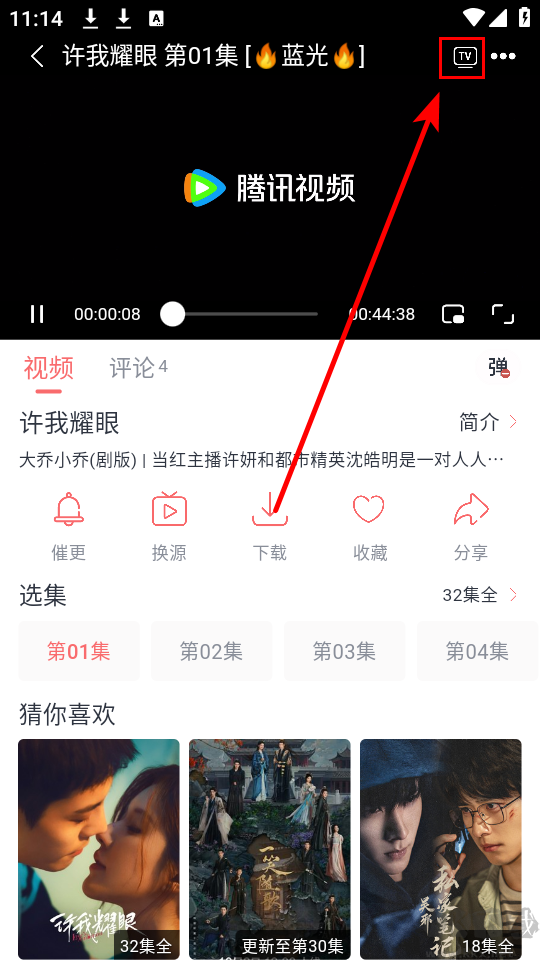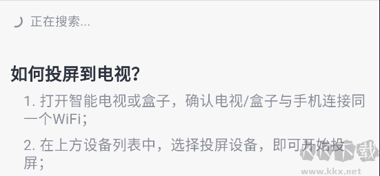 1、在播放页面点击右上角的TV图标,软件会自动搜索投屏设备。