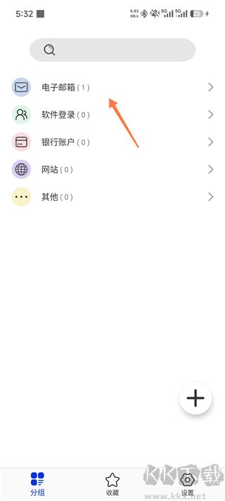 展示电子邮箱、软件登录等五大分类,点击右下角+号可进入新增密码/分组界面。
