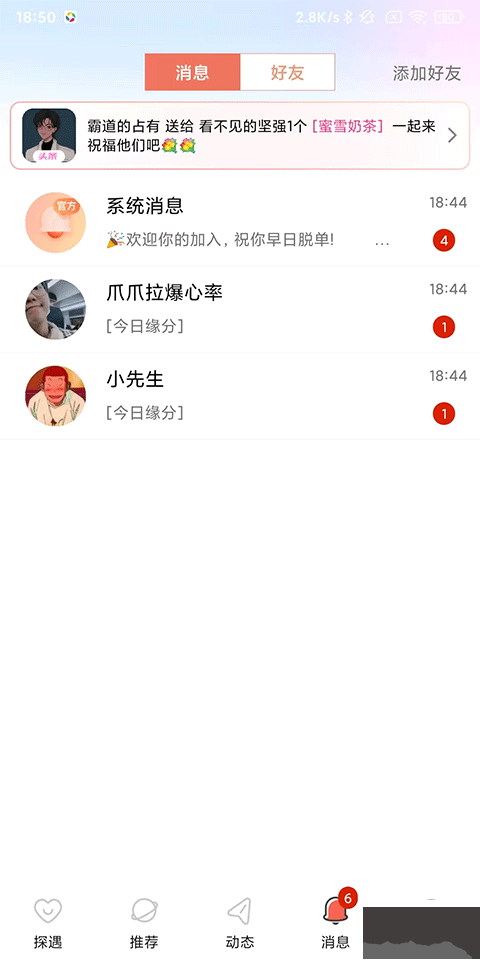 【主动搭讪】在探遇,男生常会收到来自女生主动发送的消息,请保持礼貌与分寸,也可在设置中自行开启勿扰模式!