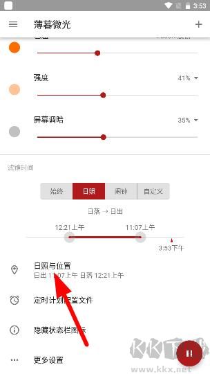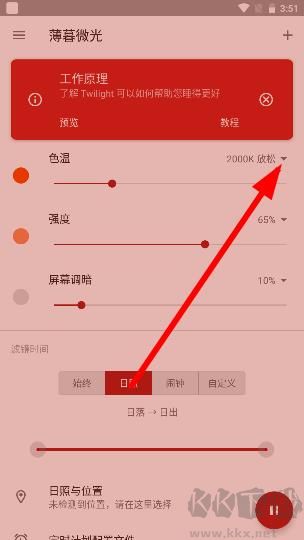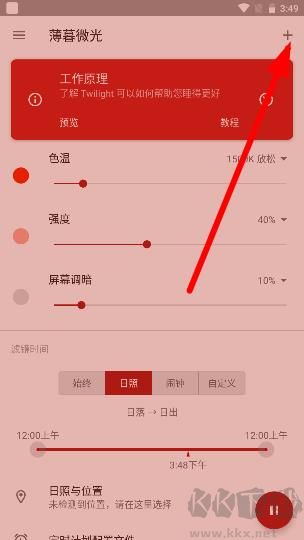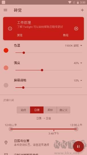 薄暮微光app(Twilight)是一款专业手机护眼软件,可以让设备屏幕随时间变化自动调整。日落后会过滤手机、平板屏幕的蓝色光谱,用柔和舒适的红色滤镜呵护双眼。功能完备,支持色温、强度、屏幕暗度、滤镜时长等参数调节,能调整屏幕光源的亮度与颜色,通过减少蓝光实现护眼效果。软件兼容性极佳,可以流畅运行于安卓手机、平板、Chromebook笔记本、安卓手表、安卓电视等设备,操作十分简便。需要的朋友快来下载试试吧!