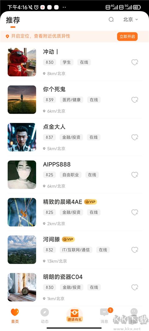优先推荐附近优质用户,清晰显示对方的实时距离及最近上线时间。