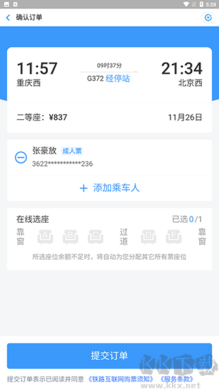 3、核对好时间和地点后,选择乘车人和在线选座,点击提交订单即可购票成功。