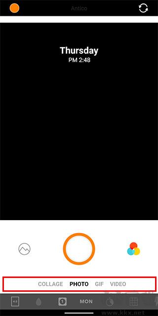 3、而工具栏上方是相机拍摄类型从左到右分别是拼贴连拍、相机、gif、录像