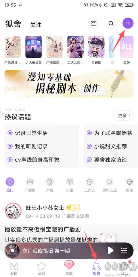1、点击【狐舍】,右上角【+】图标;