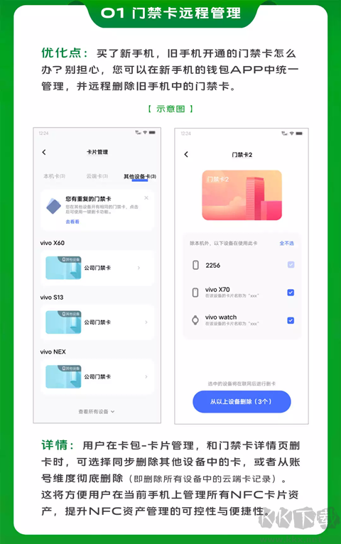 【实用卡证】NFC门禁卡:手机轻碰即可开门,即使断网或锁屏状态下也能使用(仅限支持NFC的机型);NFC交通卡:兼容50余种交通卡,覆盖全国300多个城市,公交地铁一刷即乘,还能享受专属折扣(仅限NFC机型);vivo Pay:支持碰一碰闪付与二维码支付,无需打开APP即可完成付款,并可参与银联支付优惠活动;电子卡证:免费开通常用电子证件,出门忘带实体证也不怕,无卡出行更轻松自在。