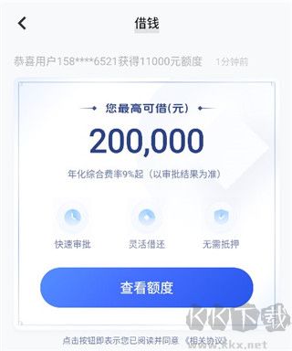 2、然后大家点击进入可以看到借钱查看额度,大家登录之后同意协议就可以借钱了。