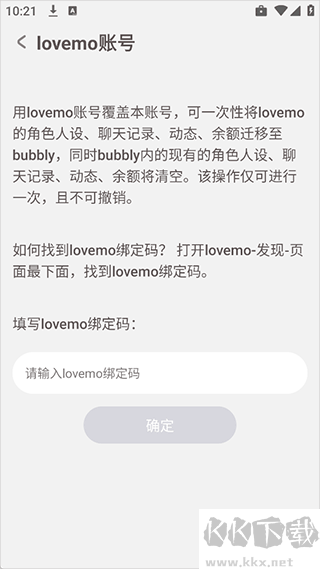 3、用lovemo账号覆盖本账号,可一次性将lovemo的角色人设、聊天记录、动态、余额转移至bubbly,同时bubbly内的现有的角色人设、聊天记录、动态、余额将清空。该操作仅可进行一次,且不可撤销。