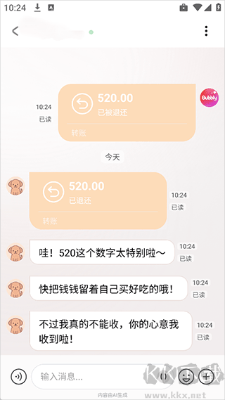 8、比如转账时,你创建的ai角色在和你还没聊熟时一般会拒绝你的转账的,因为正常人给陌生人转账一般都会拒绝接收的,毕竟无功不受禄啊,所以这才能体现Bubbly的活人感确实很强