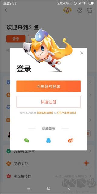 1、运行斗鱼直播,使用微信、微博、QQ,手机号等方式注册登入。