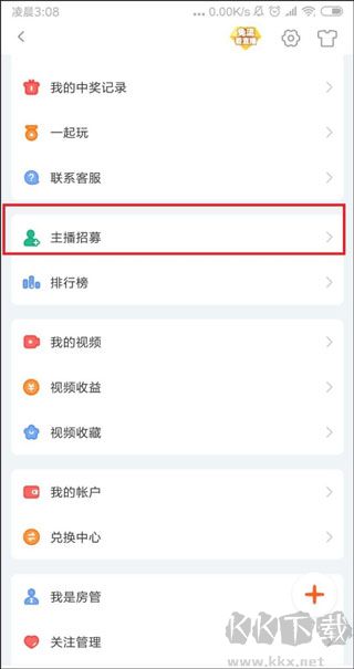 2、点击屏幕左上方的头像进入登陆个人中心页面,找到菜单栏拉中的主播招募,并点进去。