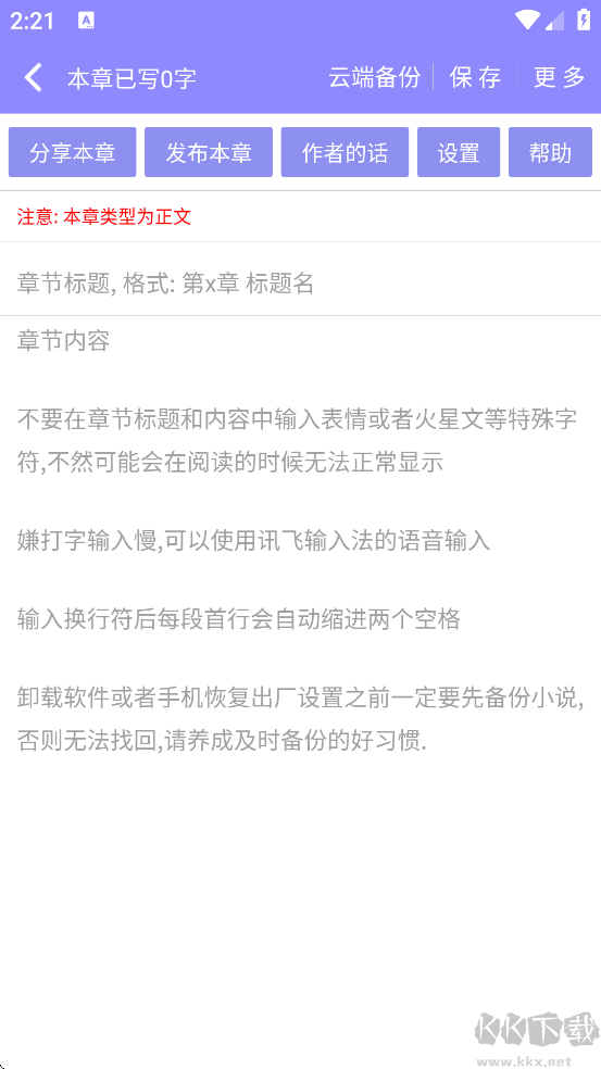 2、提供语音输入、专属草稿箱、章节自由排序、首行自动缩进、智能排版、小说预览、快捷标点输入、夜间模式、字体大小调节、导出为TXT文件、横竖屏切换写作等多项贴心功能。