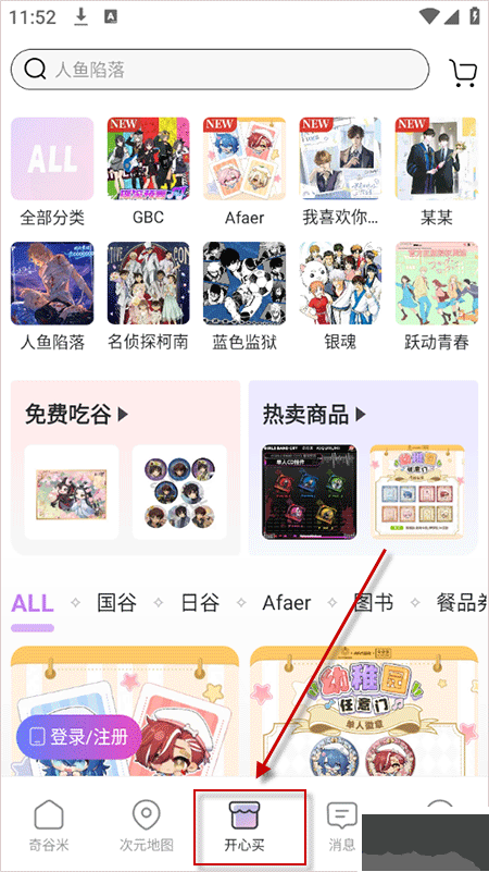 3、购买正版周边,点击“开心买”板块,浏览“热卖商品”“国谷/日谷”分类,或搜索IP名称,选择商品,点击“立即购买”,确认收货地址后选择支付方式;