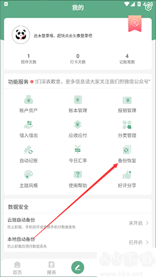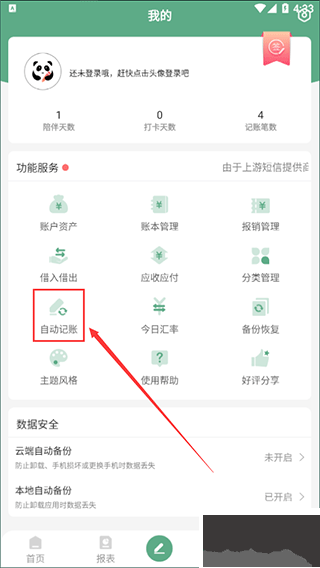 2、在“我的”页面中你可以看到账本管理、报销管理、分类管理、备份恢复等各种实用功能,选择“自动记账”功能进入;