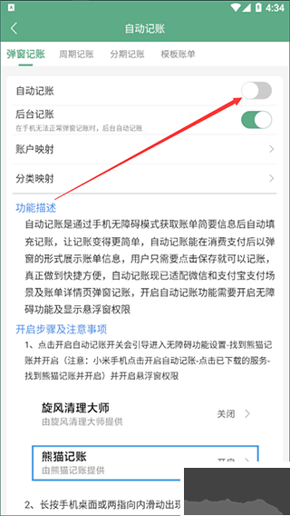 3、开启自动记账选项,最后按照当前页面下方的步骤进行一些设置即可。