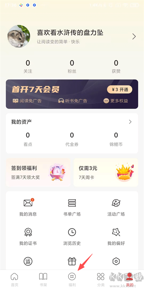 1、打开连尚免费读书APP,注册登录账号后点击【福利】页;