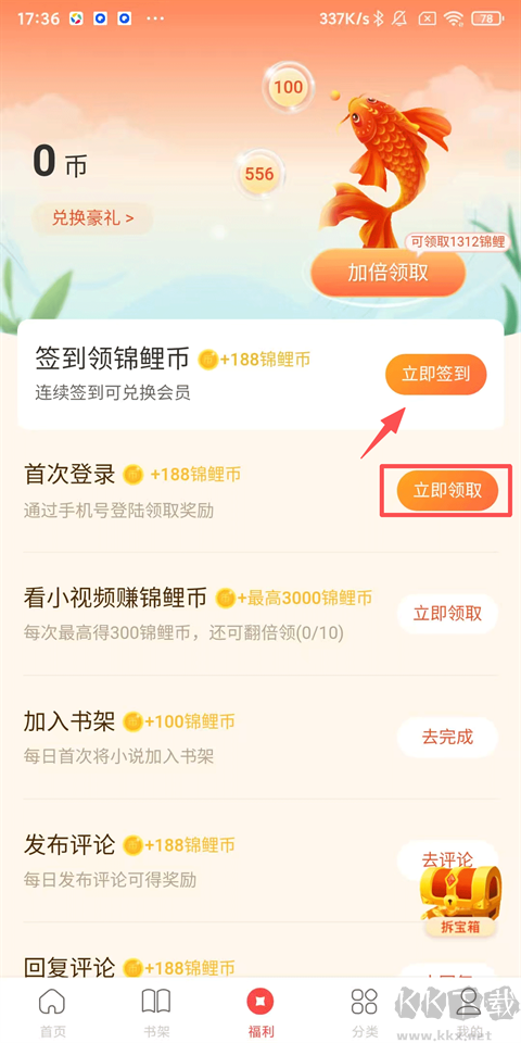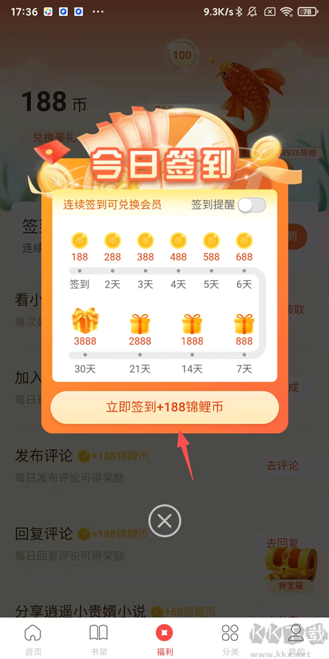 2、点击【立即签到】,首次登录还可领取188锦鲤币;