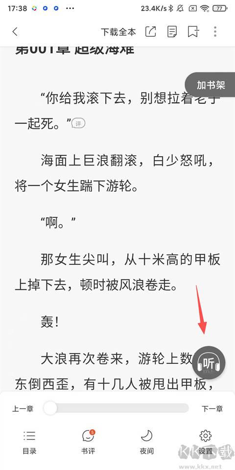 2、打开后在阅读页面轻点,点击右下角的【听】按钮;
