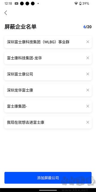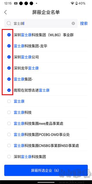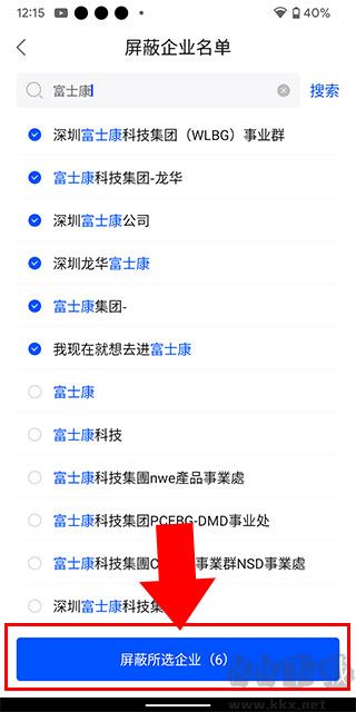 6、以关键字“富士康”为例子,搜索后选中想要屏蔽的公司,可切换搜索关键字选中多个