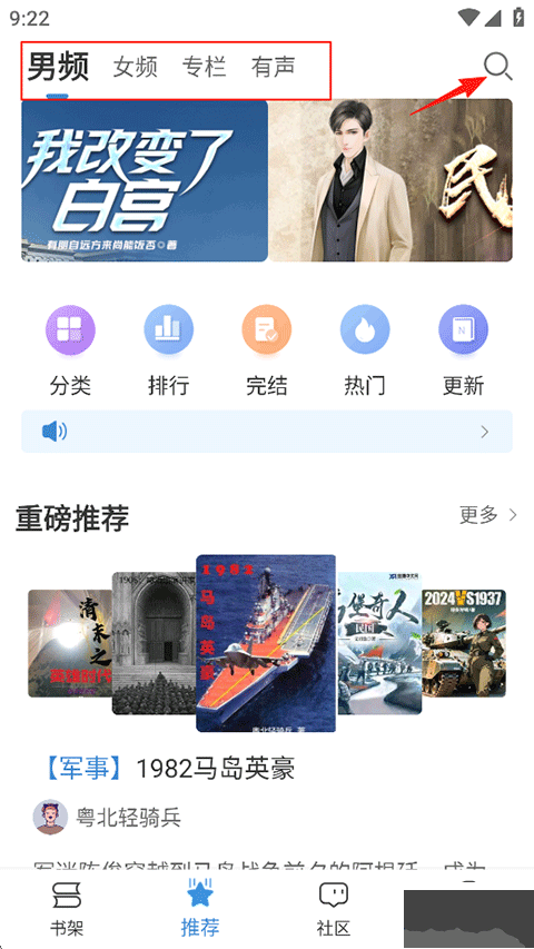 1、打开息壤阅读APP,在推荐页面可以依照分类筛选或搜索想观看的小说书籍;