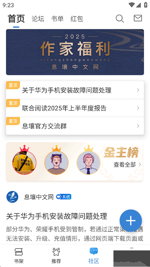 4、在社区模块还能与书友、作者进行沟通交流,点击右侧的+符号即可发布内容;