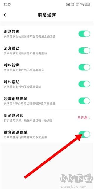 3、在消息通知页面,点击后台通话提醒选项开启。