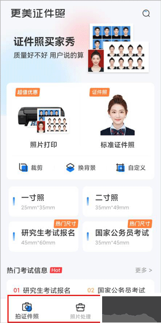1、打开更美证件照app,有拍证件照、照片处理和我的版块;