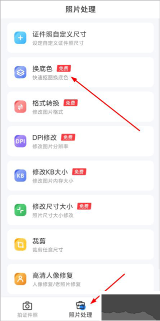 2、打开照片处理,点击换底色(也可选择拍证件照页面的换背景功能替换);