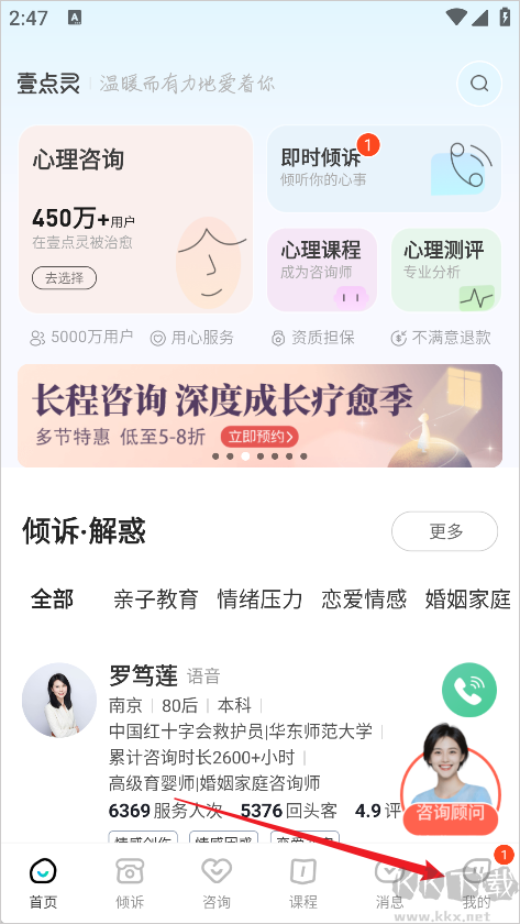 1、【心理咨询】一键预约专家,享受一对一专属心理咨询服务,涵盖心理健康、婚恋情感、情绪管理、人际关系、亲子教育、职场压力、个人成长等领域,提供线上线下多种咨询方式,助力用户解决生活中的困扰。