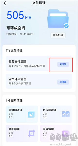 您可以在网盘首页工具栏(滑动)点击【文件清理】进入,选择重复文件清理(包含视频文件)、空文件夹清理、重复图清理、相似图清理、截图清理、录屏清理等。