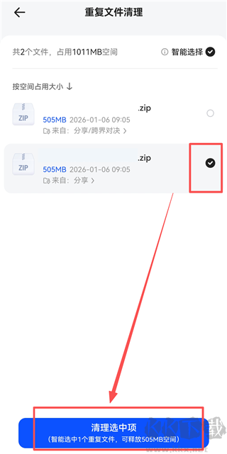 3、我们网盘中的重复文件就展示在此,选择需要的清理,点击【清理选中项】即可。