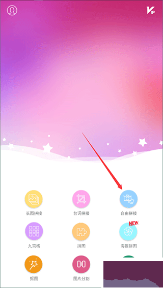 1、打开图片拼接秀app,根据自己的需求选择拼接方式,点击【自由拼接】功能进入(不想自己动手的小伙伴可以直接套用【海报拼图】内的模板哦);