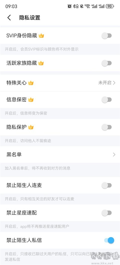 2、将禁止陌生人私信关闭即可不会收到不认识的用户的信息。