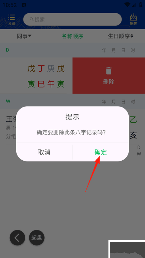 3、选中需要删除的八字信息记录左滑,点击删除;