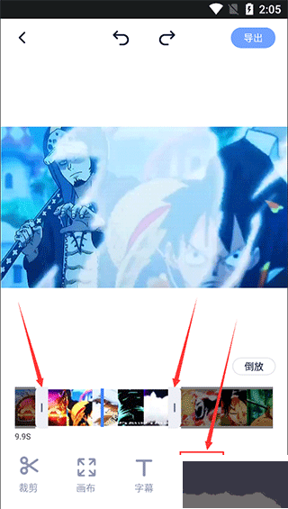 4、在视频编辑页面下方,我们能看到【裁剪】、【画布】、【字幕】【倒放】、【音乐】等功能,我们选择【倒放】功能,然后按照自己的需求调整视频的时间轴