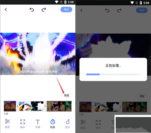 5、调整完成后,点击时间轴上方的【倒放】按钮,然后等待处理完成后,就能预览倒放效果