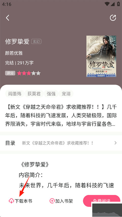 2、点击进入后,用户不仅可以加入书架还可以下载本书,点击免费阅读进入阅读模式;
