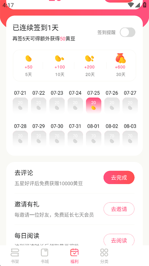 福利多多,每日登录即可领取黄豆,彻底告别付费阅读。