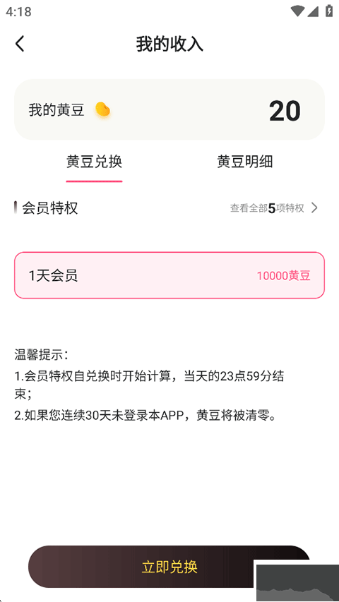 7、另外,获得的黄豆可以点击收入记录兑换会员。
