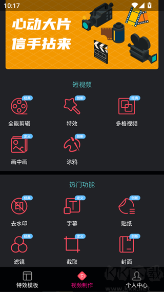 1、打开视频剪辑助手App,软件分为两大板块【视频制作与特效模板】其中,视频制作板块包含短视频剪辑和热门工具功能。
