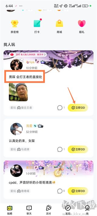 1、打开软件在玩吧界面可以看到有一些找人玩的用户点击立即DD