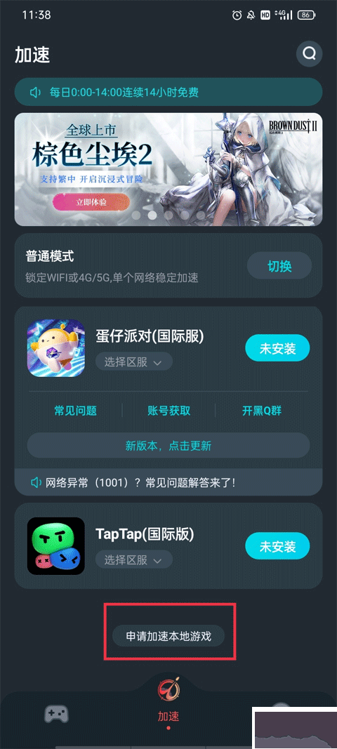 1、 启动应用程序抵达主操作区,点按下方指示条的【加速】按键,寻到“申请加速本地游戏”的选项并点选。