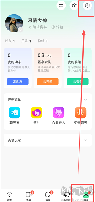 1、打开MOMO陌陌App,进入【更多】界面,点击右上角设置图标。